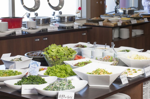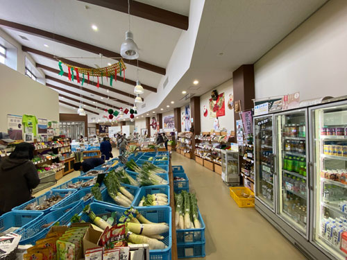 大人気の「レストラン響」は、バイキング形式で地元の野菜を使った料理を楽しめます。産直売り場では、新鮮な野菜や果物、お菓子などのお土産が豊富にそろっています。