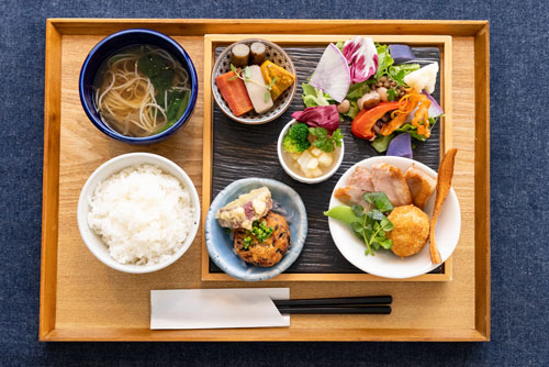 地元の野菜や果物や比婆牛、手作りの加工品など自慢の逸品が盛りだくさんです。新鮮な食材をふんだんに使ったランチバイキングは大人気。高野りんごのジュースやジャム、アップルパイはぜひお試しあれ!